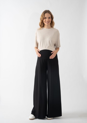 Spodnie ciążowe z szeroką nogawką oraz z elastycznym pasem, który dopasuje się do rosnącego brzuszka ciążowego, a miękki materiał zagwarantuje komfort noszenia. Wykonane z gładkiej wiskozy, w klasycznym czarnym kolorze.