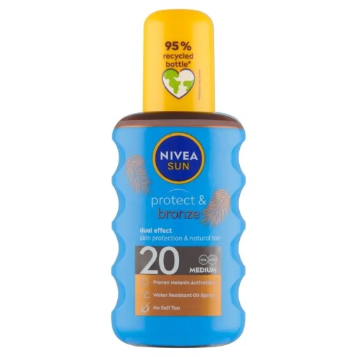 NIVEA Sun ProtectBronze Olejek w spray'u naturalnie aktywujący opaleniznę SPF 20Pielęgnacja:Produkt dzięki naturalnemu systemowi pro-melanin pomaga osiągnąć naturalną i piękną opaleniznę i to z 0% samoopalacza. Zawiera ekstrakt roślinny z lukrecji, który w naturalny sposób pomaga stymulować i pobudzać procesy opalania w skórze (in vitro).Ochrona: Zawiera wysoce skuteczny system filtrów UVA/UVB zapewniający natychmiastową ochronę przed poparzeniem słonecznym oraz przedwczesnym starzeniem się skóry.Naturalnie uzyskany antyoksydant pomaga chronić skórę przed uszkodzeniami słonecznymi, wspierając jej naturalne procesy ochronneTolerancja dla skóry potwierdzona dermatologicznie.W 100% zgodne z Hawajskim Rozporządzeniem Ochrony Rafy Koralowej. Produkt bez oktoksylanu i oksybenzonu.Zaufaj jakości NIVEA Sun!