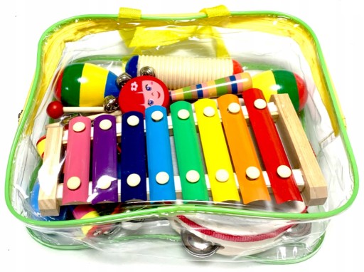 W praktycznym plecaczku znajdują się m.in. cymbałki, tamburyn / bębenek, trójkąt, kastaniety, grzechotki, gwizdki oraz dzwoneczki. Ten wyjątkowy zestaw z pewnością skradnie serce niejednego malucha. Wykonane zostały z drewna i pomalowane na żywe kolory, które z pewnością przypadną dziecku do gustu. Posiadają uniwersalny rozmiar, dzięki czemu nadadzą się zarówno dla przedszkolaka jak i dziecka w podstawówce. Będą doskonałym wyposażeniem na rytmikę czy muzykę i z pewnością pomogą maluchowi w poznawaniu dźwięków i rytmu.