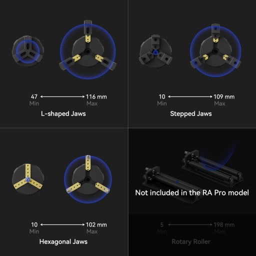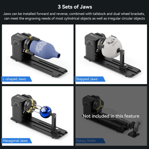 [Wielofunkcyjny moduł obrotowy]: SCULPFUN RA Pro jest wyposażony w trzy zestawy pazurów (pazury trapezowe, pazury w kształcie litery L, pazury sześciokątne). Dzięki zmianie akcesoriów może rzeźbić przedmioty o bardziej nieregularnych kształtach, takie jak kieliszki do wina. , piłki baseballowe, kije baseballowe, szklanki, kubki z uchwytami itp. Dzięki temu Twoje możliwości twórcze są szersze i spełniają potrzeby większej liczby projektów grawerowania. (Uwaga: RA Pro nie zapewnia obrotowego koła)