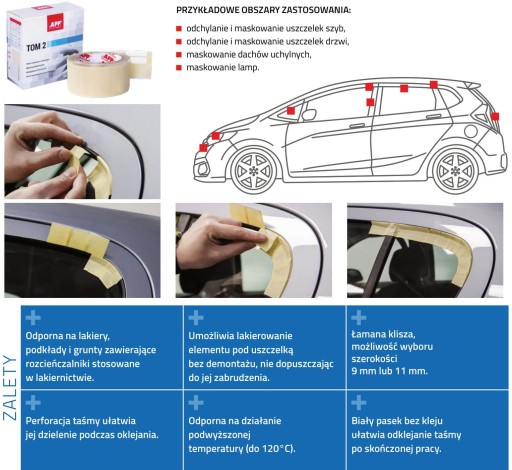 APP TOM 2 samoprzylepna taśma z dzieloną kliszą 9/11mm przeznaczona do maskowania i jednoczesnego odchylania gumowych uszczelek samochodowych.