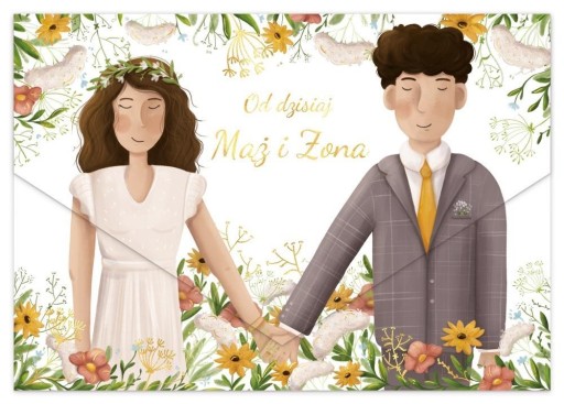 Karnet z kieszonką na pieniądze w formacie B6, składany w poziomie. Złocony i tłoczony, teksy życzeń w środku. Wydrukowany na wysokiej jakości papierze. W zestawie koperta.