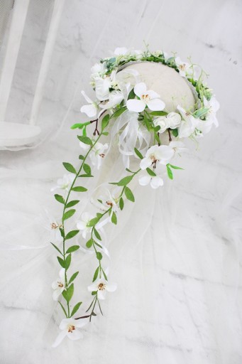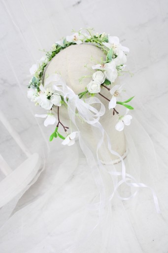 Niezwykłej elegancji dodają wiankowi kaskadowo spływające tasiemki.