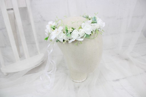 Piękny i niepowtarzalny wianek komunijny, upleciony z kwiatów jaśminu i różyczek oraz eleganckich zielonych dodatków traw, idealnie wpisujących się w obecne trendy.