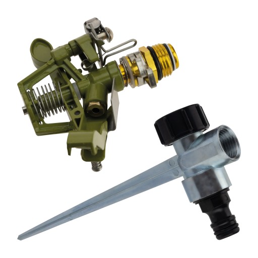 Zraszacz ogrodowy pulsacyjny dostępny na naszej aukcji wyróżnia się nie tylko funkcjonalnością, ale przede wszystkim wysoką jakością wykonania. Wykonany z trwałego stopu cynku i aluminium, zapewnia niezawodność i długotrwałość użytkowania. Solidny, długi kolec ułatwia jego stabilne wbicie w ziemię.