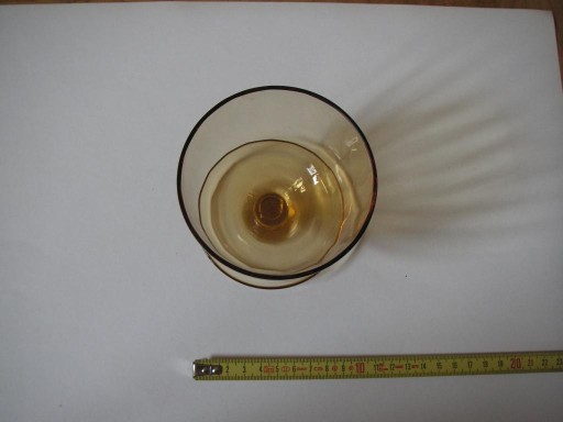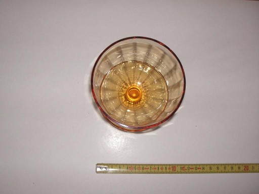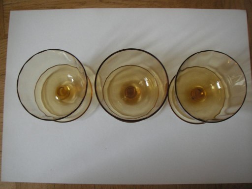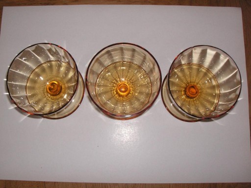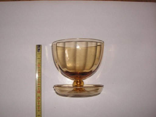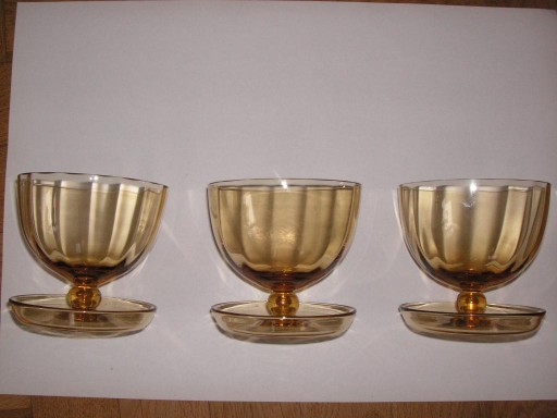 Pucharki do lodów rasowe Art Deco. Średnica wlewu 10,0 cm, średnica spodeczka 10,0 cm, wysokość 9,0 cm. Szkło prasowane, szlifowane na krawędzi wlewu. Kolor miodowy. Puchar zespolony ze spodeczkiem co daje rzadko spotykaną funkcje możliwości spływania zroszonej na powierzchni pucharu wody na spodeczek bez plamienia obrusu. Przedmioty używane zachowane w bardzo dobrym stanie. Jeden z pucharków lekko ukruszony na krawędzi wlewu bez uszczerbku na waloru użytkowe. Liczba pucharków oferowanych 9 szt.