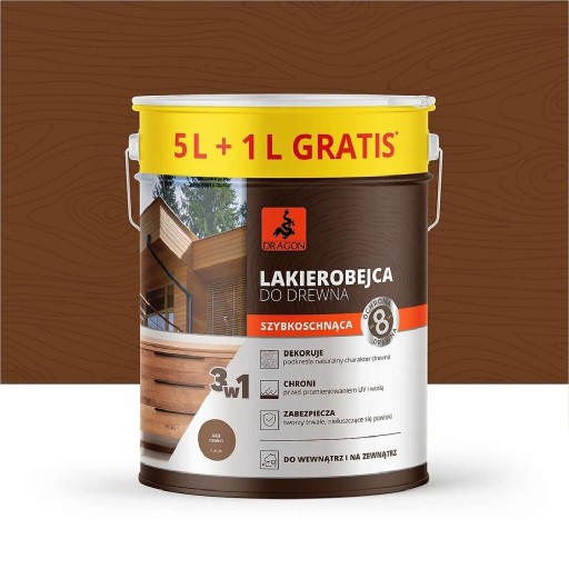 Szybkoschnąca Lakierobejca Dragon to wysokiej jakości produkt ochronno – dekoracyjny do zabezpieczenia drewna zarówno wewnątrz pomieszczeń jak i na zewnątrz. Dzięki zaawansowanej formule 3 w 1 idealnie sprawdzi się jako produkt, który impregnuje drewno, nadaje kolor i chroni na lata.