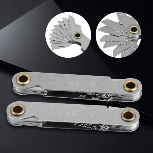 Metryczne60°(20 listków): 0,5, 0,6, 0,7, 0,75, 0,8, 1,0, 1,25, 1,5, 1,75, 2,0, 2,5, 3,0, 3,5, 4,0, 4,5, 5,0, 5,5, 6,0, 6,5, 7,0.