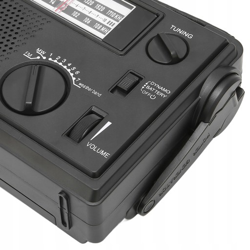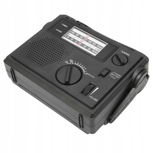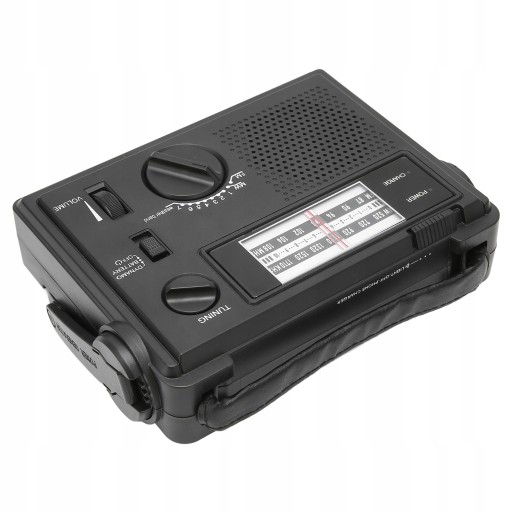- Metoda ładowania: ładowanie korbą ręczną, 4 baterie AA (brak w zestawie), ładowanie USB