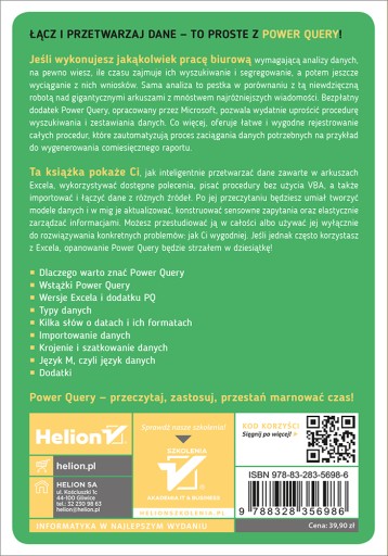 Ta książka pokaże Ci, jak inteligentnie przetwarzać dane zawarte w arkuszach Excela, wykorzystywać dostępne polecenia, pisać procedury bez użycia VBA, a także importować i łączyć dane z różnych źródeł. Po jej przeczytaniu będziesz umiał tworzyć modele danych i w mig je aktualizować, konstruować sensowne zapytania i elastycznie zarządzać informacjami. Możesz przestudiować ją w całości albo używać jej wyłącznie do rozwiązywania konkretnych problemów: jak Ci wygodniej. Jeśli jednak często korzystasz z Excela, opanowanie Power Query będzie strzałem w dziesiątkę!