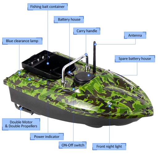 Bezprzewodowe sterowanie umożliwia wypuszczanie przynęty daleko w jeziorze, rzece i zbiorniku. Duże pojemniki na przynętę mogą pomieścić około 3,3 funta przynęty, aby zwabić ryby. Łatwa obsługa dla miłośników wędkarstwa lub początkujących, a także przyjemna dla dzieci.