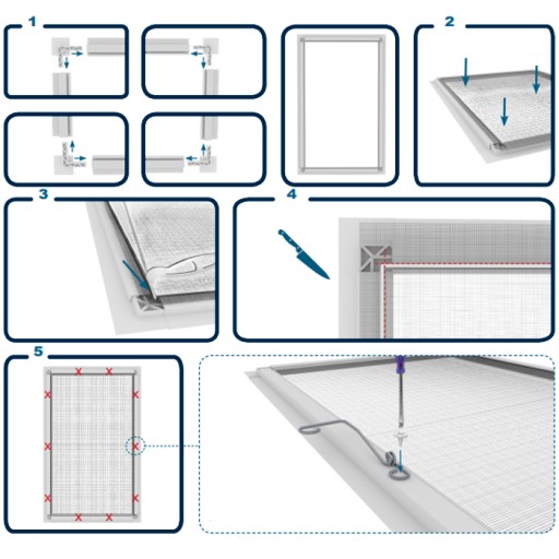 1) Ułóż profile moskitiery i złącz je narożnikami - otrzymasz szkielet moskitiery.