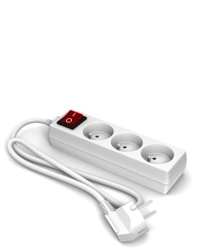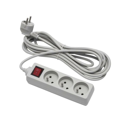 Przedłużacz sieciowy w kolorze białym z trzema gniazdami przeznaczony do użytku domowego. Przedłużacz pozwala podłączyć urządzenia, które są oddalone od gniazda elektrycznego. Produkt z jednej strony posiada 3 gniazda obrócone pod kątem oraz włącznik, a z drugiej pojedynczy kątowy wtyk sieciowy.
