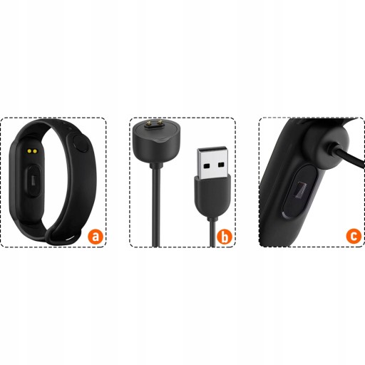 c) Wystarczy że końcówkę kabla skierujesz w kierunku styków pod modułem opaski, silny magnes sam nakieruję Ci i pomoże poprawnie podłączyć moduł opaski do ładowania.