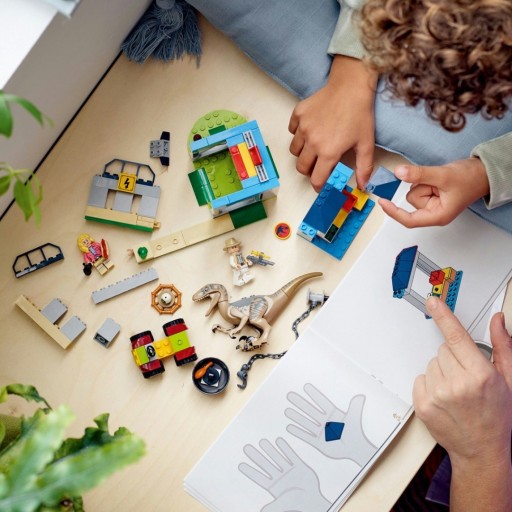 - Zestaw startowy — zapoznaj dzieci w wieku od czterech lat z zestawami LEGO® Jurassic World dzięki LEGO® Ucieczka welociraptora (76957), w którym znajduje się ruchoma figurka welociraptora, zagroda dinozaura i terenówka