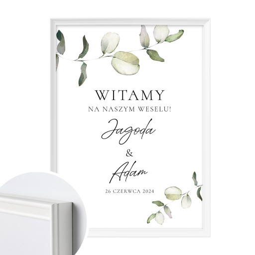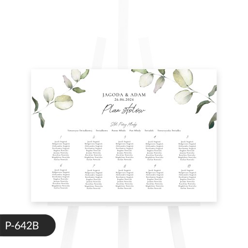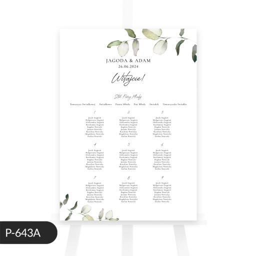 Weselny plakat powitalny / plan stołów w stylu boho, rustykalnym. Delikatna grafika liści eukaliptusa.