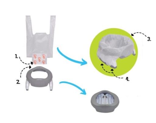W zależności od sytuacji nasz nocniczek można wyposażyć w silikonowy wkład, wyraźnie ułatwiający jego utrzymanie w czystości, gdy stosujemy go w domu lub w jednorazowe, pochłaniające ciecz i przykre zapachy woreczki. Dzięki temu drugiemu rozwiązaniu nocnik stanie się idealnym rozwiązaniem turystycznym.