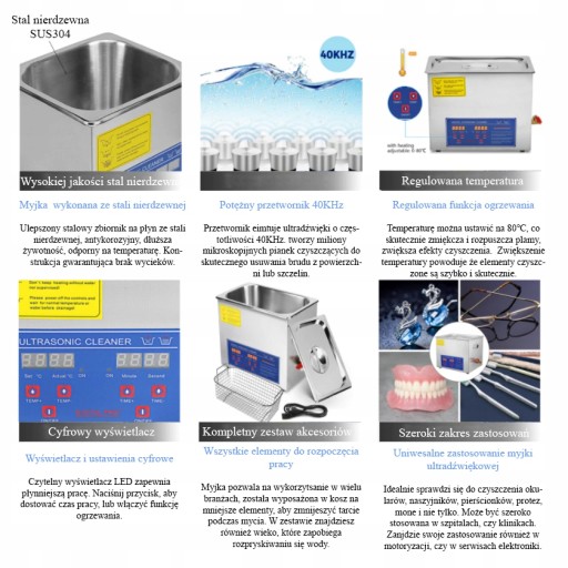 Myjka ultradźwiękowa o pojemności 30L, idealna do czyszczenia, konserwacji. Stosowana przez elektroników, jubilerów, optyków, fryzjerów, gabinety kosmetyczne, modelarzy i wielu innych. Drgania fal ultradźwiękowych usuwają zanieczyszczenia z powierzchni. Możliwe jest czyszczenie biżuterii, okularów, szkła, zegarków oraz dóbr konsumpcyjnych takich jak: głowice golące, protezy dentystycznej, artykuły piśmienne, wyroby metalowe i więcej.