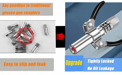 Kompatybilny ze wszystkimi smarownicami z przyłączem 1/8" NPT. Przystawka do smarownicy jest odpowiednia dla wszystkich baterii 1/8" NPT, pneumatycznych, ręcznych smarownic i złączek Zerk, pasuje również do wszystkich smarownic DIN i SAE. Ulepszona szczęka może pracować pod wysokim ciśnieniem bez deformacji.