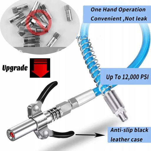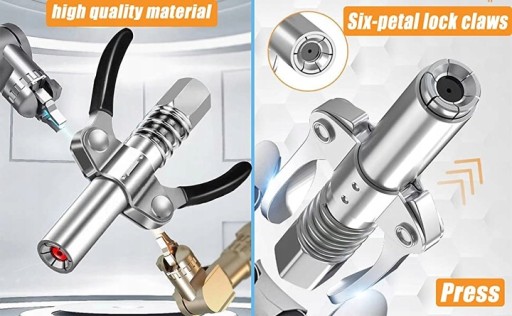 Nasz łącznik do smarownicy z ulepszoną konstrukcją 6-szczękową łatwiej zatrzaskuje się i zwalnia, wzmocnione szczęki i wysokiej jakości uszczelka zapewniają długotrwałą i stabilną wydajność, nie przecieka nawet przy ekstremalnym ciśnieniu 12 000 PSI.