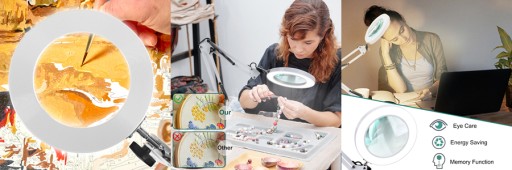 Wyposażona w 5-krotną lupę z prawdziwego szkła dla wyraźniejszego widoku. Posiada w pełni regulowane ramię umożliwiające łatwe kontrolowanie oświetlenia. Jest idealna do zadań profesjonalnych, czytania, prac artystycznych i rękodzieła oraz innych hobby.