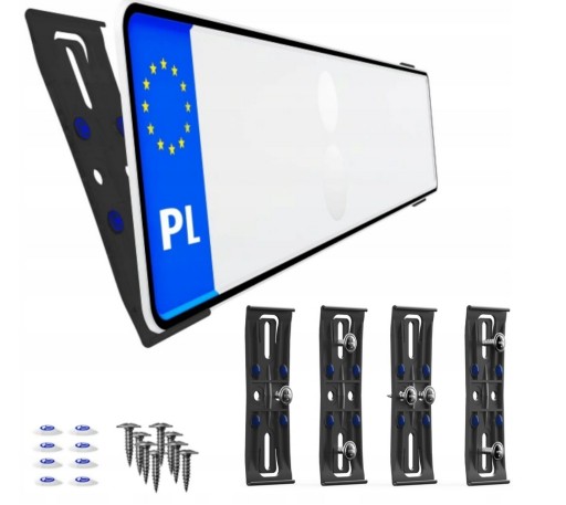 Komplet na tył i przód samochodu! W zestawie znajdują się 4 czarne ramki\uchwyty do 2 tablic rejestracyjnych na przód i tył,NAKLEJKI ANTYPOŚLIZGOWE , 8x wkręty montażowe, dzięki którym zamocujesz ramki za pomocą wkrętaka.