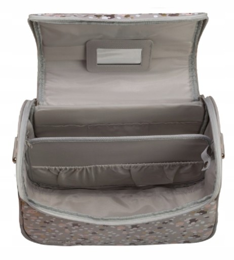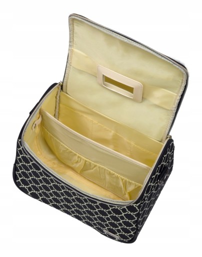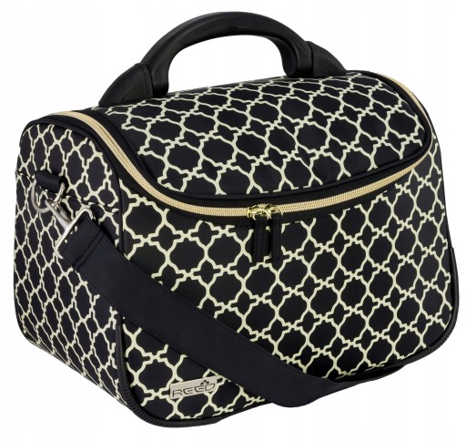 Kuferki wykonana z ładnego, nieprzemakalnego materiału, wnętrze wyłożone podszewką. Wewnątrz dwie komory przedzielone sztywną ścianką, którą w razie potrzeby można wypiąć i usunąć. Na każdej ze ścianek są kieszonki na gumki oraz gumki podtrzymujące różne drobiazgi. Na klapce lusterko odpinane na rzepa. Na tylnej zewnętrznej ściance dodatkowa kieszonka na zamek. Dno usztywnione i wzmocnione. Pod spodem nóżki plastikowe. Boki usztywnione i wzmocnione narożnikami plastikowymi zapobiegającymi zabrudzeniom i otarciom. Mocna, wygodna, duża, ruchoma plastikowa rączka do noszenia oraz dodatkowo regulowany pasek do noszenia na ramieniu. Z przodu eleganckie, metalowe logo REED.