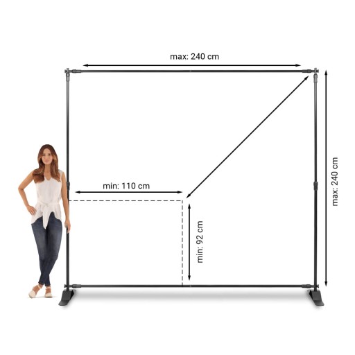 Stelaż posiada możliwość regulacji, co oznacza, że minimalny wydruk może mieć wymiary 110cm x 92cm, a maksymalny 240cm x 240 cm. Dzięki temu można dopasować stelaż do aktualnych potrzeb.