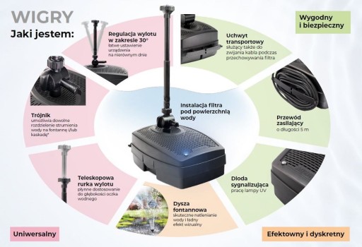Dyskretnie zainstalowany filtr pod powierzchnią wody w oczku, nie zaburza jego aranżacji. Ergonomiczne zatrzaski ułatwiają dostęp do wnętrza urządzenia, wygodny uchwyt transportowy służy także do nawijania kabla zasilającego podczas przechowywania filtra w okresie zimowym. Zasilanie filtra, zarówno pompy jak i lampy UV odbywa się jednym przewodem o długości aż 5 metrów, co ułatwia jego podłączenie do źródła zasilania. Świecący element w obudowie sygnalizuję pracę lampy UV bez konieczności wyciągania filtra z wody.
