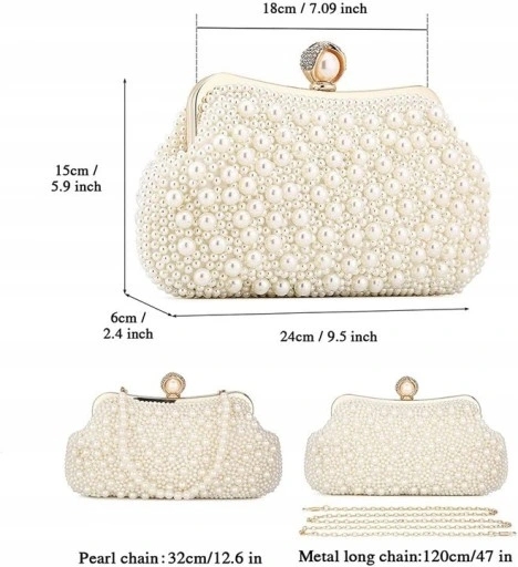 - Wielofunkcyjny pasek na ramię – ta torebka wieczorowa z perłami do dyspozycji jest 2 paski na ramię – krótki pasek z pereł, długi metalowy pasek na ramię – które są dostępne w różnych długościach i nadają się do różnych metod noszenia.