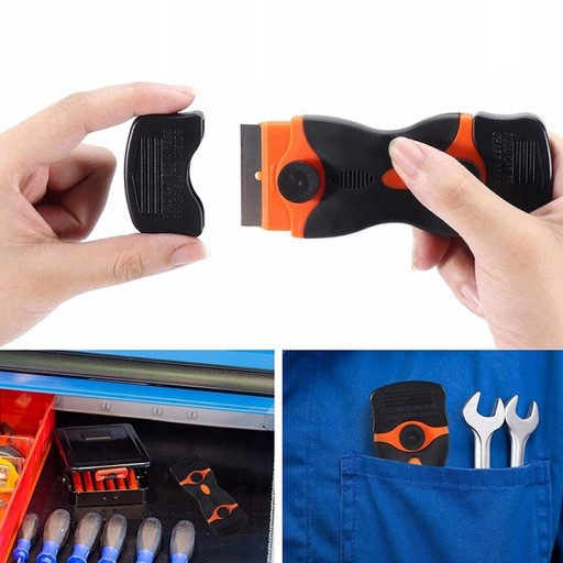 - Skład zestawu: Skrobak, 6x ostrze stalowe, 1 ostrze tworzywo sztuczne (pomarańczowe).