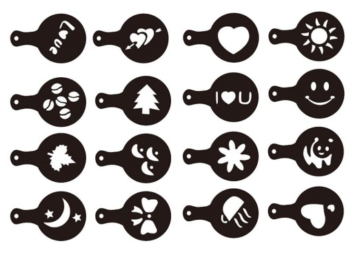 Zestaw 16 szablonów wielokrotnego użytku do dekorowania kawy i deserów. Każdy ze wzorników odpowiada za inną okazję i nastrój, dzięki czemu doskonale spersonalizujesz swoją poranną kawę bądź zabłyśniesz przy gościach jako profesjonalny barista :)