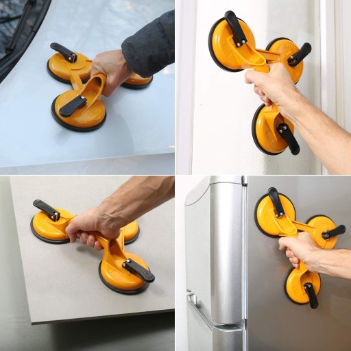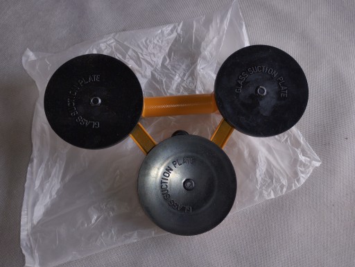 - Potrójny podnośnik ssący z trzema przyssawkami ze specjalnej gumy (Ø przyssawka: 123 mm) i wytrzymałym uchwytem do noszenia z aluminium