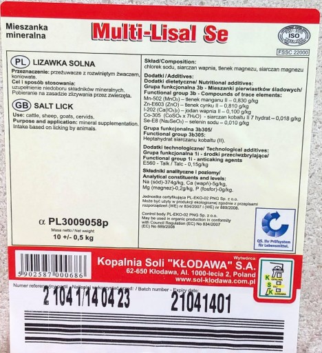 Lizawki solne otrzymywane są ze zmielonej soli kamiennej na drodze prasowania z mieszanką minerałową zawierającą mikroelementy - magnez, mangan, cynk, kobalt, jod, selen,. Lizawki solne mineralizowane odpowiadają normie ZN-97/1:2004. Produkt nie zawiera alergenów oraz środków spożywczych GMO.