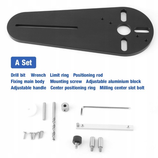 Wiertarka, klucz, pierścień ograniczający, pręt pozycjonujący, stały korpus główny, śruby mocujące, regulowany blok aluminiowy, regulowany uchwyt, środkowy pierścień pozycjonujący, śruba do rowka środkowego frezowania