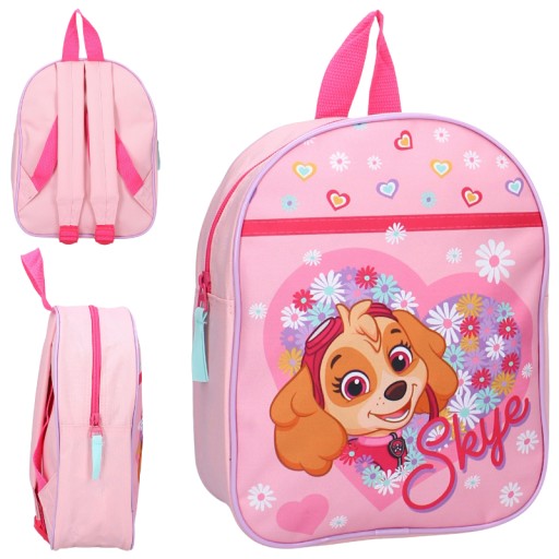 Wykonany jest w różowym kolorze z fuksjowymi, czerwonymi i miętowymi detalami, a z przodu plecaka znajduje się wiosenny nadruk z motywem uwielbianego pieska z Psiego Patrolu - Skye.