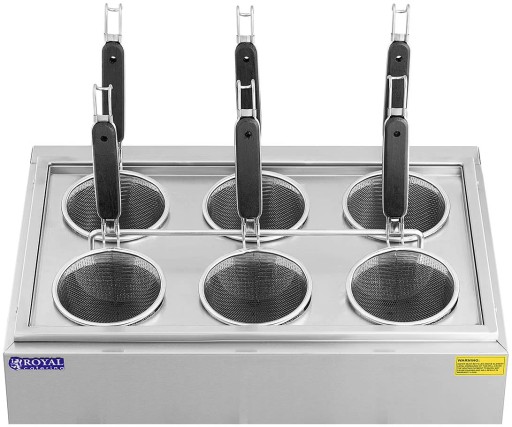 Warnik do makaronu marki Royal Catering pozwala przygotować różne rodzaje makaronu zaledwie w kilka minut. Sprawdzi się w restauracjach i barach szybkiej obsługi. Duża moc 3000 W jest równomiernie rozłożona na trzy wbudowane elementy grzejne. Temperaturę regulować można w zakresie 30-110° dla każdej z trzech stref. Trzy wbudowane krany spustowe pozwalają wygodnie opróżnić zbiornik. Konstrukcja urządzenia wykonana została z wysokiej jakości stali nierdzewnej. Posiada pojemnik 3 x 6,5 l oraz 6 okrągłych koszy o drobnych oczkach i wymiarach śr. 12,5 x 11 cm każdy.