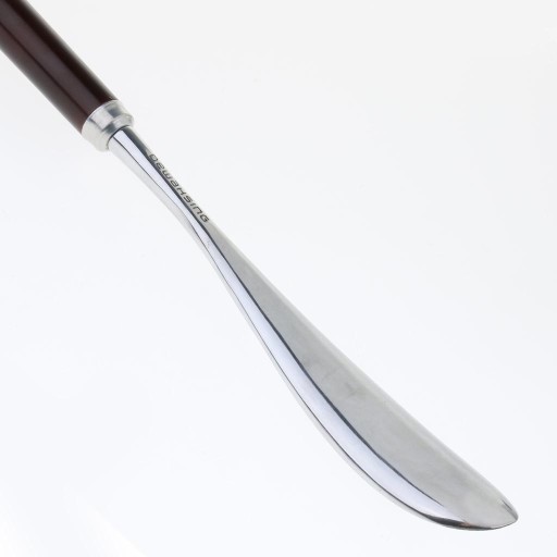 Podnośnik do butów Dolphin Head z długą metalową łyżką do butów z drewnianą rączką Schima w kolorze srebrnym