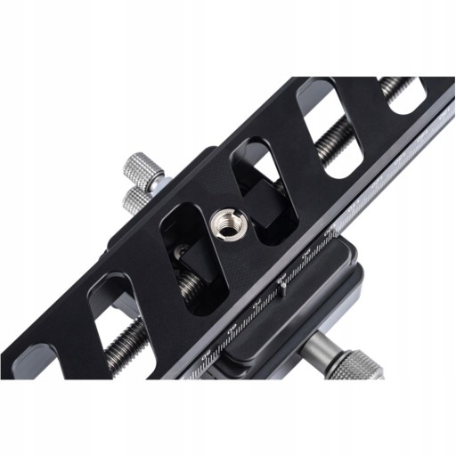 Szyna ma całkowitą długość 180 mm i można regulować odległość w zakresie 160 mm. Sama szyna wykonana jest w stylu Arca, dzięki czemu pasuje bezpośrednio na głowicę statywu w standardzie Arca.