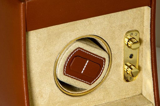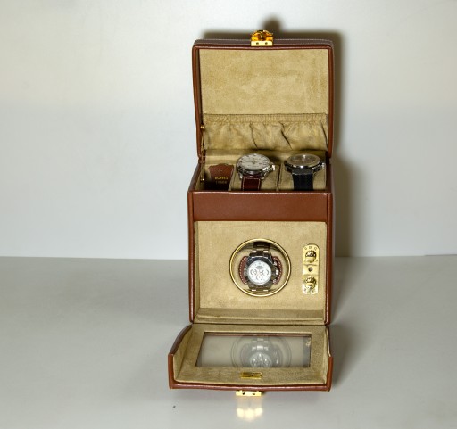 Luksusowy rotomat na 1 zegarek z dodatkową kieszonką i przegrodami na 2 zegarki i inne dodatki. Bardzo dobrej jakości skóra naturalna w kolorze jasnego brązu. Bardzo dobra jakość i technika znana m.in. z rotomatów Wolf Heritage Single Storage.