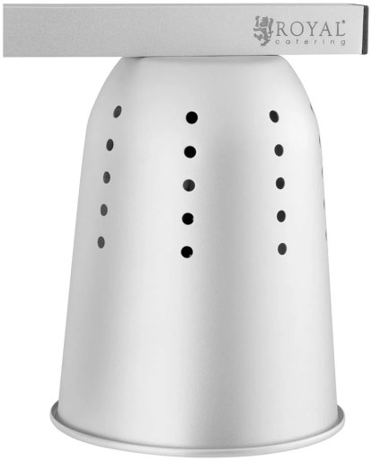 Lampa grzewcza marki Royal Catering sprawdzi się do utrzymywania w cieple różnego rodzaju potraw. Urządzenie podgrzewa jedzenie za pomocą promieni podczerwonych. W komplecie znajdują się 2 żarówki na podczerwień. Całkowita moc wynosi 500 W. Promienie podczerwone w przeciwieństwie do zwykłej żarówki wnikają do wnętrza potraw, równomiernie je podgrzewając. Wysokość lampy regulowana jest w zakresie 610-760 mm, co umożliwia regulację temperatury. Perforacja kloszy umożliwia ochłodzenie żarówek co przedłuża ich żywotność. Lampę wykonano z aluminium, jest lekka i stabilna a także łatwa w czyszczeniu.