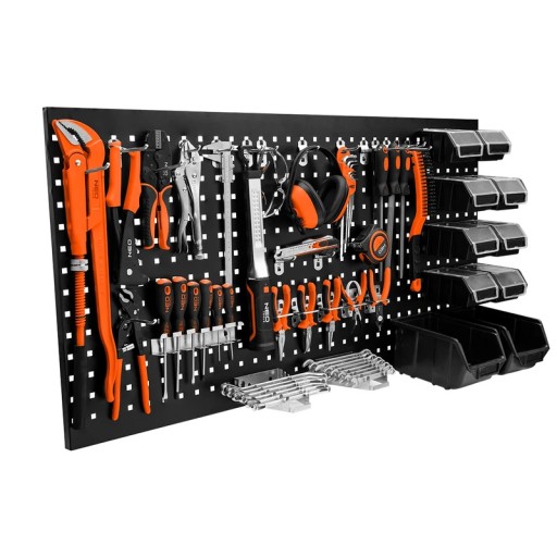 Panel narzędziowy wymiar 120 cm szerokość, 60 cm wysokość, 2 cm głębokość, stal SPCC o grubości 0.8mm, zawiera kołki rozporowe, otwór kwadrat 9x9mm, odstęp między kwadratami 29mm, rozstaw otworów montażowych 100 cm, kompatybilne z hakami 84-502, 84-503, 84-092, 84-093, 84-094, 84-095, 84-096, 84-097, 84-098