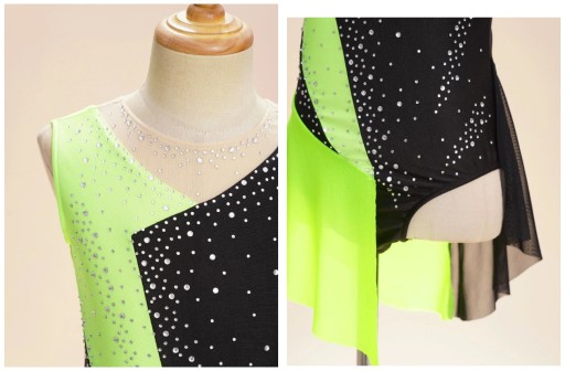 Body: miękki, elastyczny, lekko połyskliwy materiał przeznaczony do wykonywania ćwiczeń tanecznych. Z przodu asymetryczna dekoracja z różnej wielkości cyrkonii oraz asymetryczne wstawki materiału, góra oraz tył z siateczki cielistej.