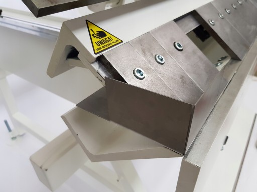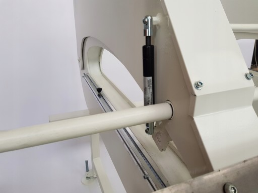 - OPORY PRZEDNIE – pozwalają ustawić szerokość cięcia od przodu zaginarki. Konstrukcja oporów pozwala na obrócenie ich o 180° oraz ich powrót w to samo położenie. Bardzo przydatne do cięcia blach seryjnie. Ograniczniki przednie stosuje się w pracach powtarzalnych. Zachowują one wielokrotnie ten sam wymiar długościowy ciętej blachy. Szybki i dokładny pomiar ciętej blachy można uzyskać poprzez wykorzystanie zainstalowanej miarki.