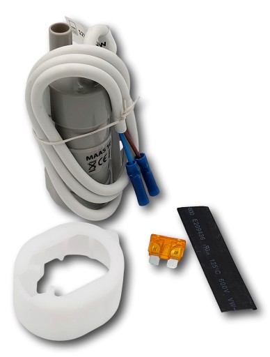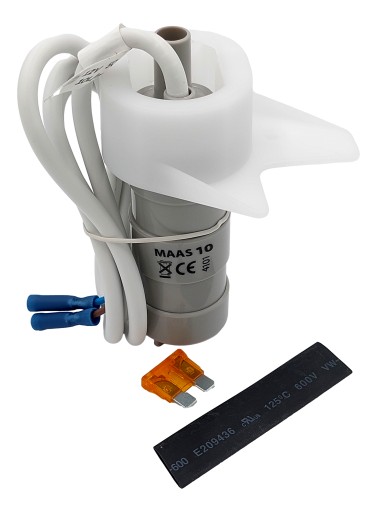 Zestaw zawiera pompę o wydajności 10 litrów, plastikowy uchwyt, bezpiecznik 5A i koszulki termokurczliwe.