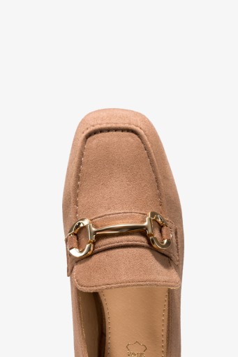 Beżowe mokasyny damskie model D24X1-BE zostały wykonane z wysokogatunkowego zamszu ekologicznego co gwarantuje doskonałą jakość i dopasowanie do stopy. Kiedy klasyka spotyka się z nowoczesnością, powstają buty, które zachwycają prostotą i elegancją. Takie właśnie są beżowe mokasyny, idealne dla osób ceniących sobie komfort noszenia, a jednocześnie chcących wyglądać stylowo. Wykonane z dbałością o każdy detal, te wsuwane mokasyny zdobi kwadratowy czubek, który nadaje stopie delikatnego i zgrabnego wyglądu. To właśnie ten kształt czyni je uniwersalnym dodatkiem do wielu stylizacji – zarówno tych codziennych, jak i bardziej formalnych. To, co wyróżnia te buty spośród innych, to przede wszystkim złota sprzączka na cholewce. Delikatny błysk tego akcentu dodaje klasy i podkreśla ich unikatowy charakter. Sprzączka nie jest jedynie ozdobą – stanowi również symbol dbałości o detale. Skórzana wkładka w butach to dodatek, który ma kluczowe znaczenie dla komfortu i higieny stóp. Niski obcas w formie klocka, daje stopom wygodę nawet po wielu godzinach noszenia. Obcas klocek, choć dyskretny, dodaje sylwetce pewności i elegancji. Jego stabilna konstrukcja sprawia, że każdy krok jest pewny i stabilny.