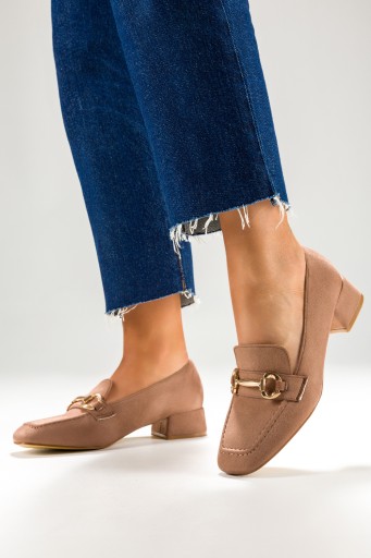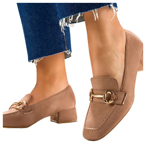BEŻOWE MOKASYNY PÓŁBUTY NA OBCASIE KLOCKU OZDOBNA SPRZĄCZKA LEKKIE