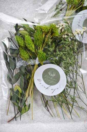 Rośliny w paczce to m.in. : kanar, eukaliptus stabilizowany, limonium stabilizowane, len, stabilizowana pistacja