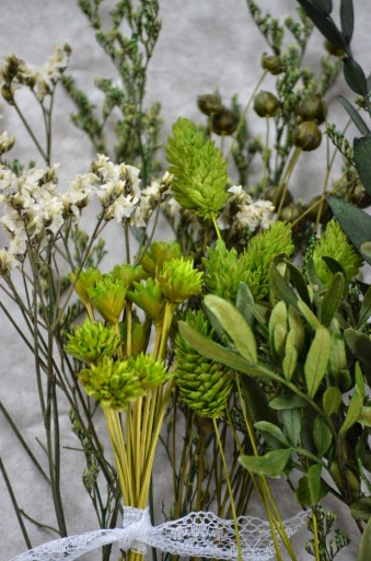 Zestaw suszonych i stabilizowanych roślin i kwiatów w odcieniach zieleni