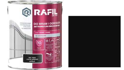 Antykorozyjna Emalia RAFIL DO BRAM I OGRODZEŃ przeznaczona jest do ochronnodekoracyjnego malowania powierzchni metalowych. Długotrwale chroni przed korozją. Tworzy trwałą i elastyczną powłokę odporną na uderzenia. Charakteryzuje się zwiększoną odpornością na działanie trudnych warunków atmosferycznych.